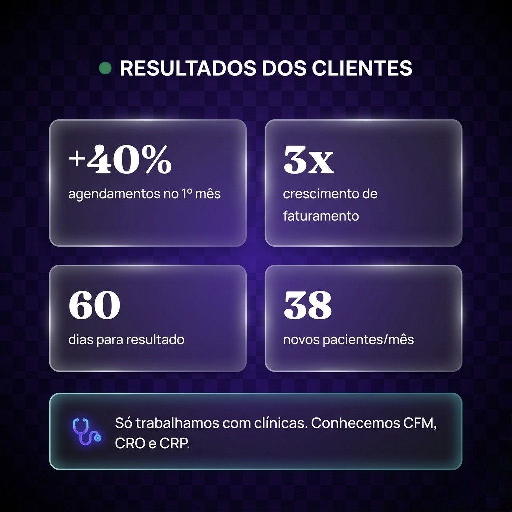 Campanhas no Google e Redes Sociais que atraem pacientes qualificados para sua especialidade, respeitando as diretrizes do CRM/CRO/CRP. Transformamos cliques em agendamentos reais.